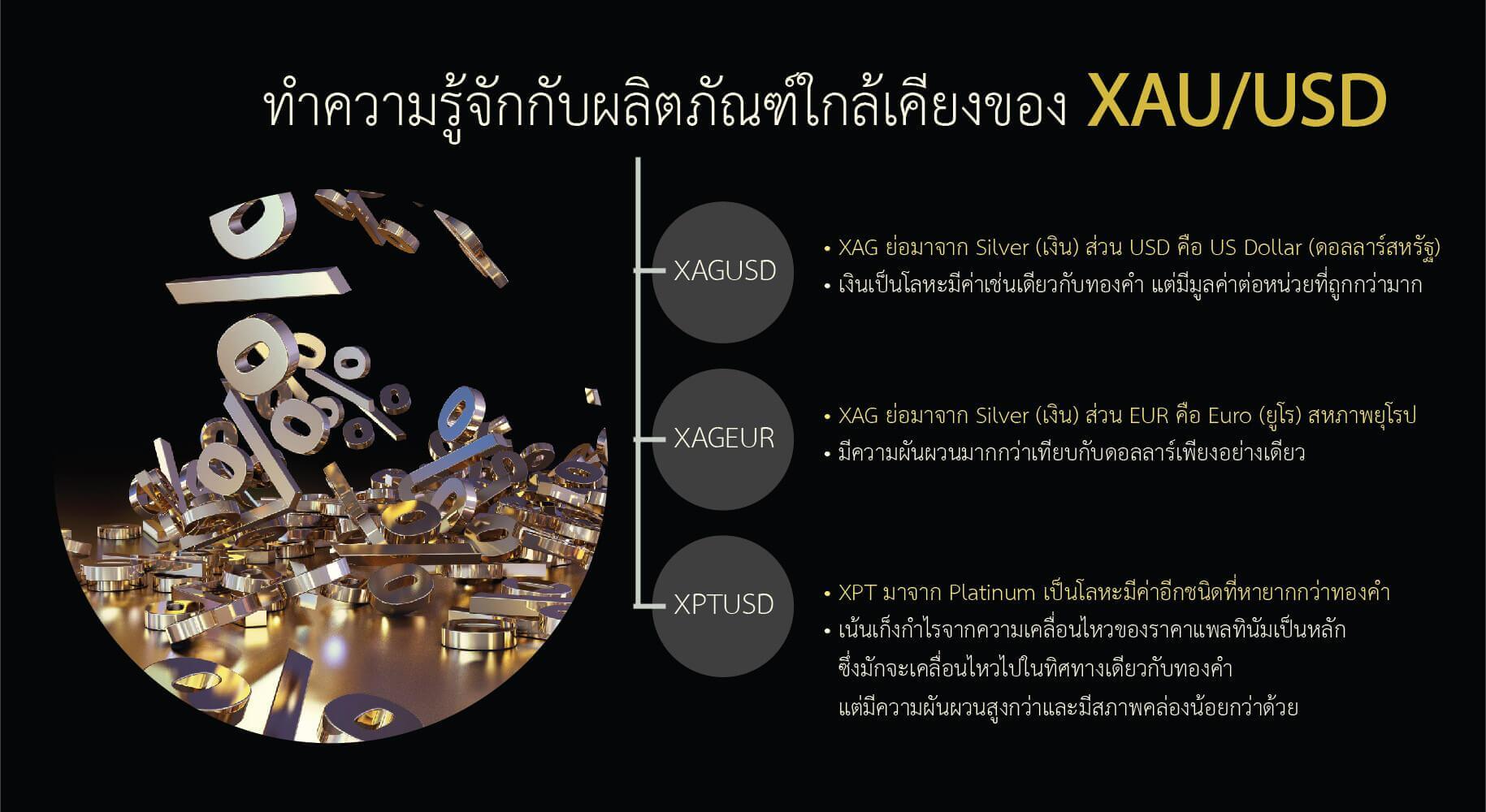 นอกจาก XAU/USD ซึ่งเป็นคู่สกุลเงินที่ใช้เทรดทองคำเทียบกับดอลลาร์สหรัฐแล้ว ยังมีผลิตภัณฑ์ใกล้เคียงอื่นๆ ที่น่าสนใจ ได้แก่ XAGUSD, XAGEUR และ XPTUSD ซึ่งสามารถอธิบายได้ดังนี้